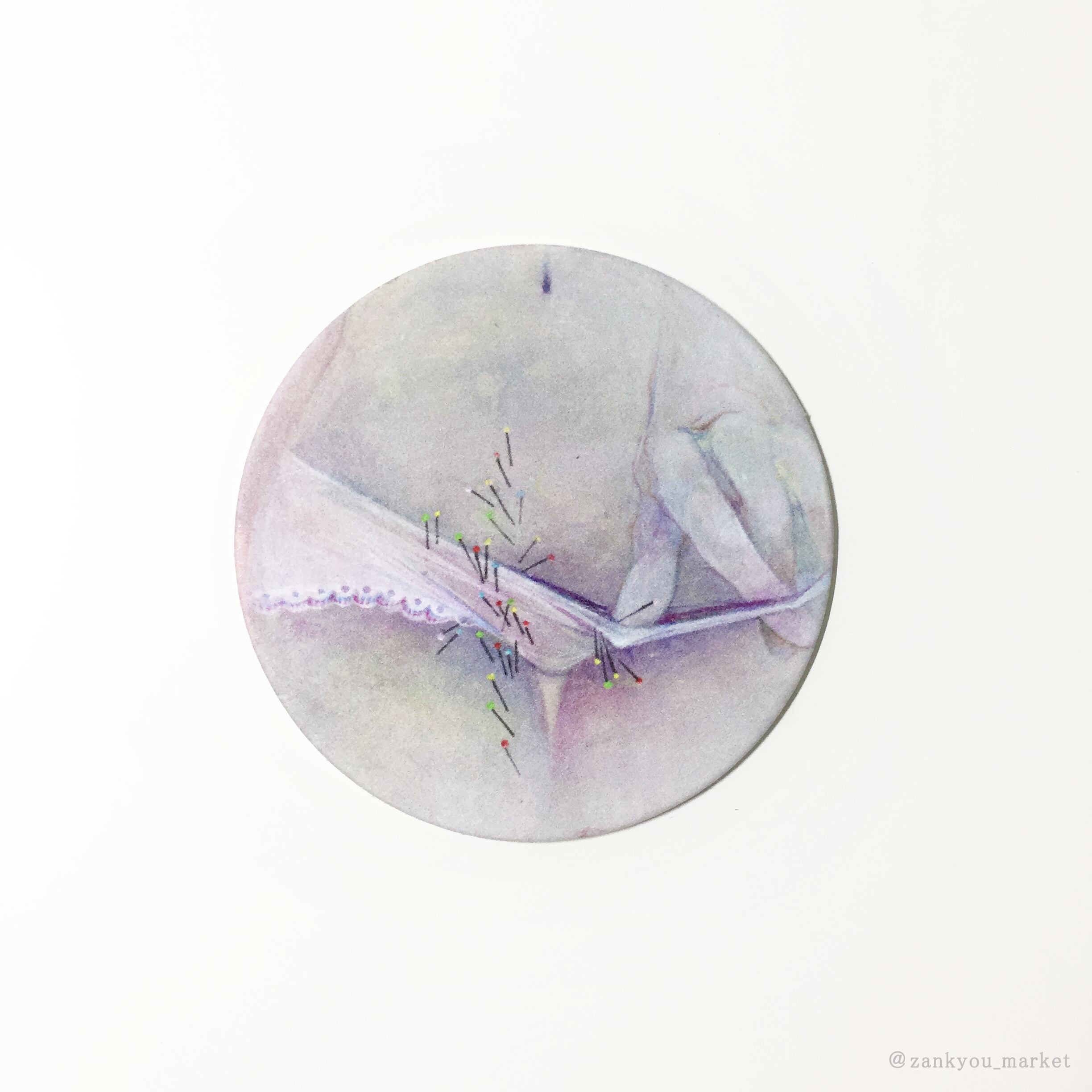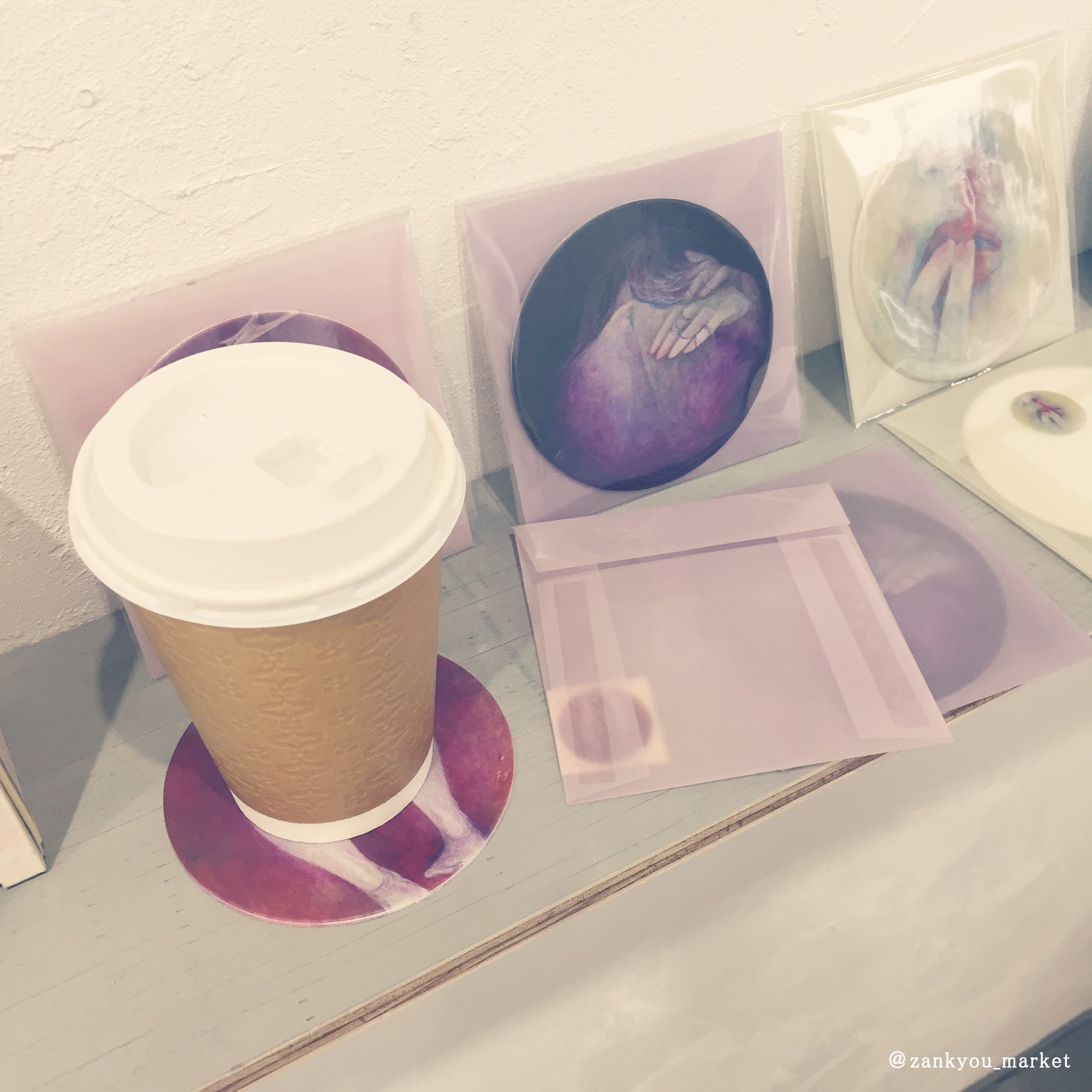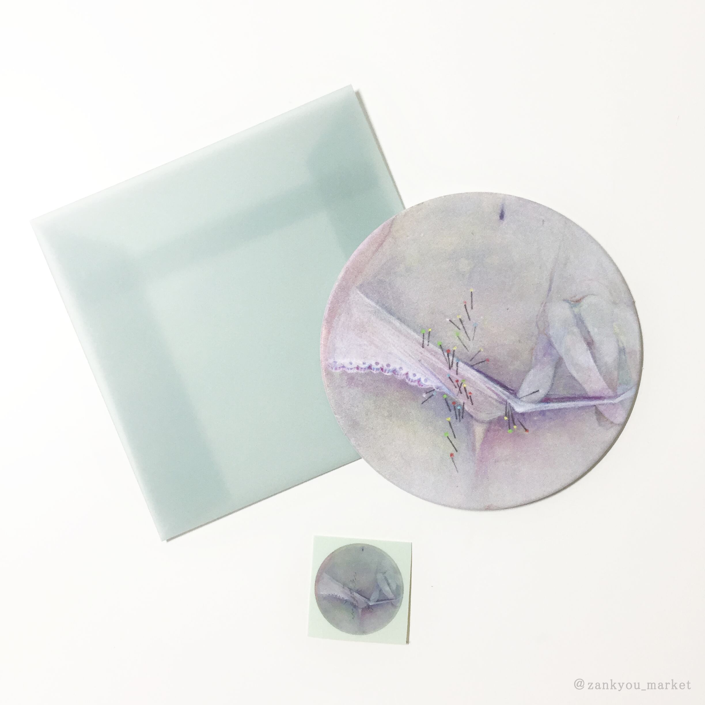絵画作品『ちくちく』の原画パネルの形を生かした紙製の丸コースターと半透明の封筒、丸シールがセットになったコースターレターセットです。