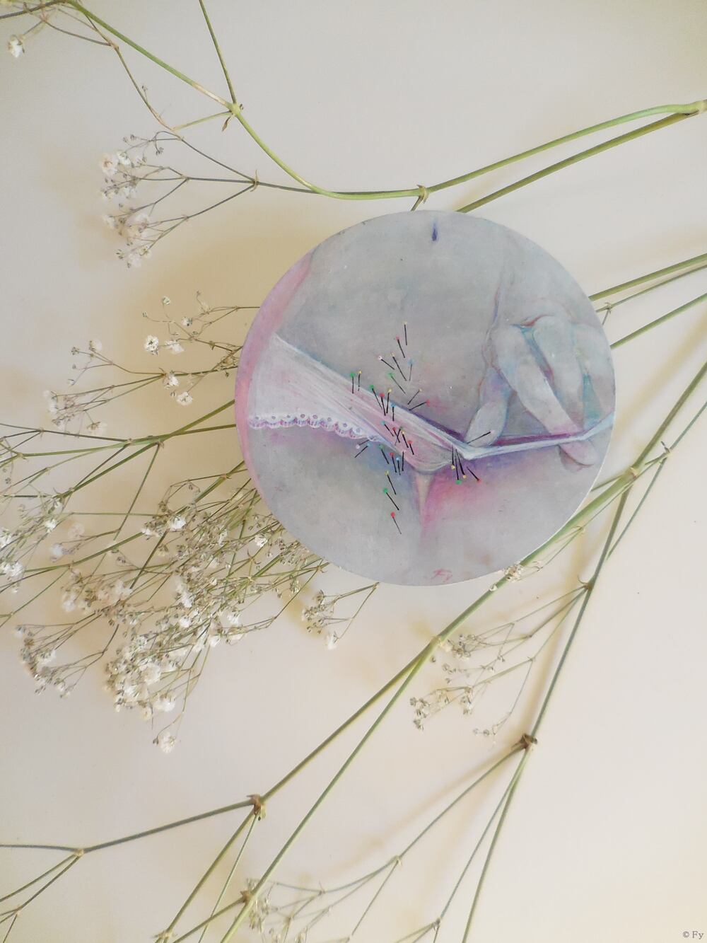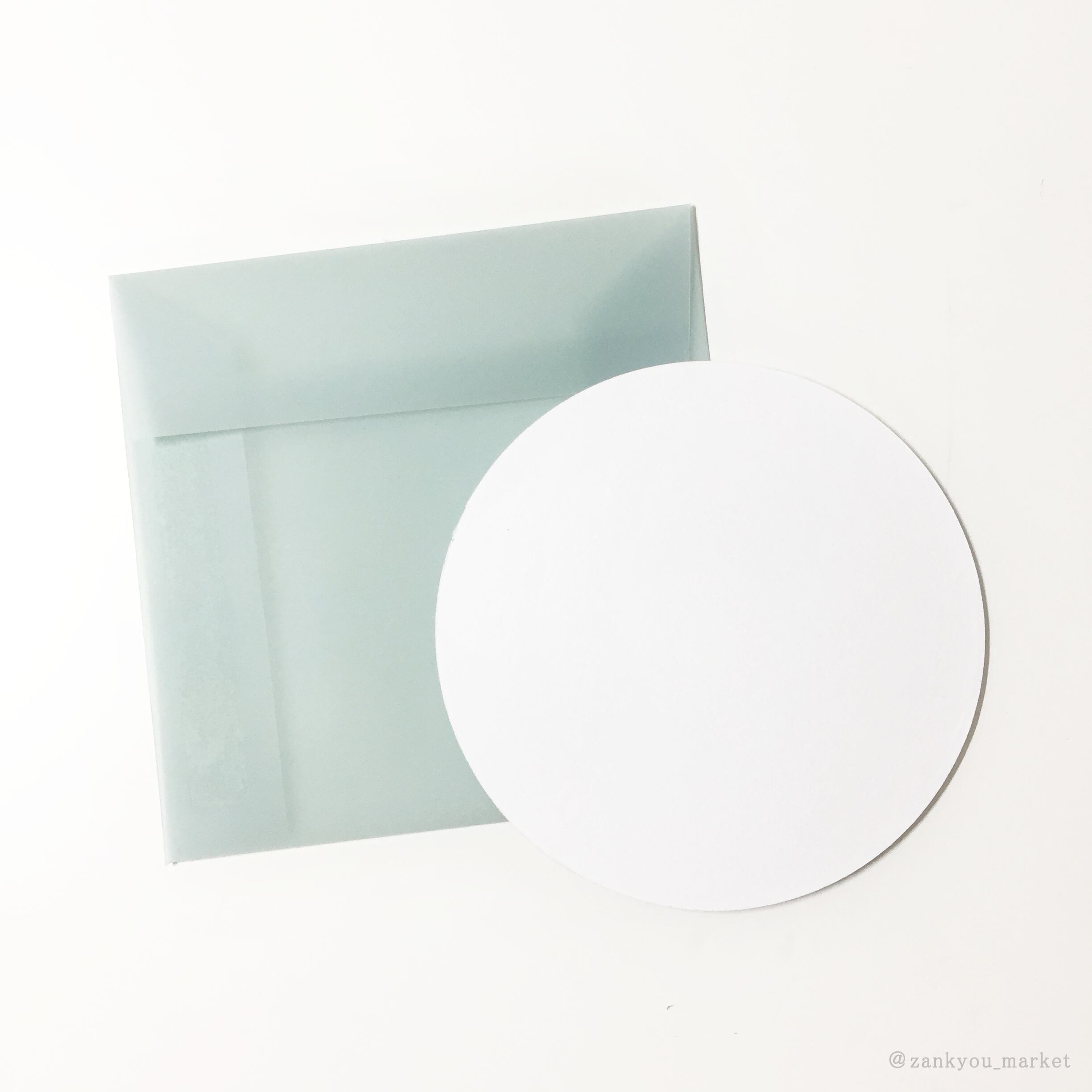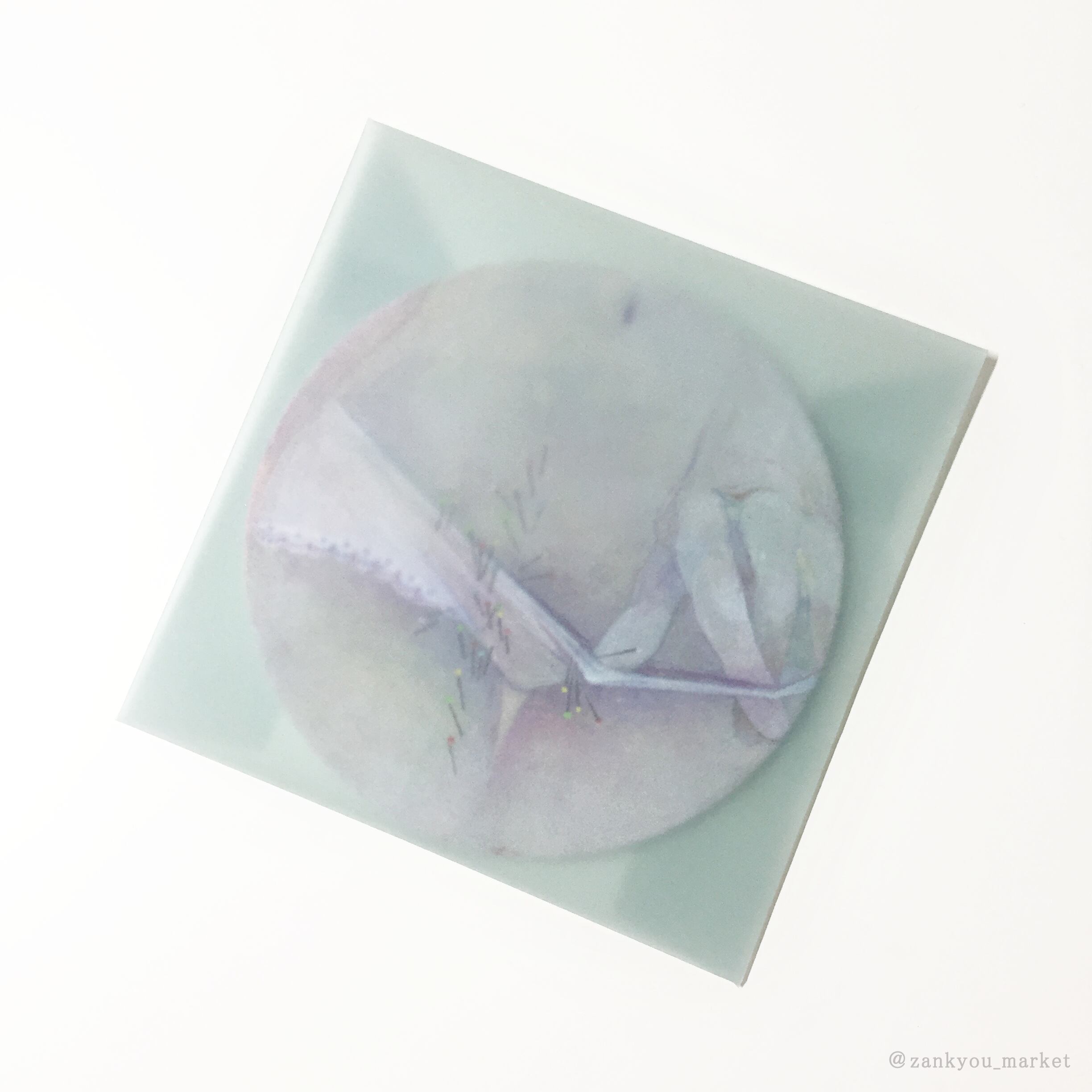 絵画作品『ちくちく』の原画パネルの形を生かした紙製の丸コースターと半透明の封筒、丸シールがセットになったコースターレターセットです。